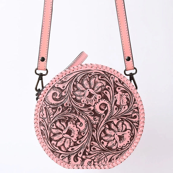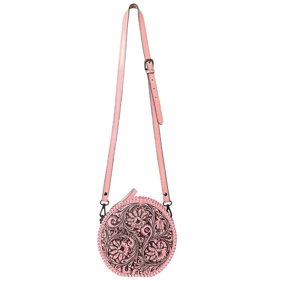 • * 100% full-grain hand-tooled leather * Soft pink finish with dark floral tooling contrast * Round structured silhouette with whipstitched edge * Zippered top closure for secure storage * Leather crossbody strap for versatile wear * Compact, lightweight design for essentials