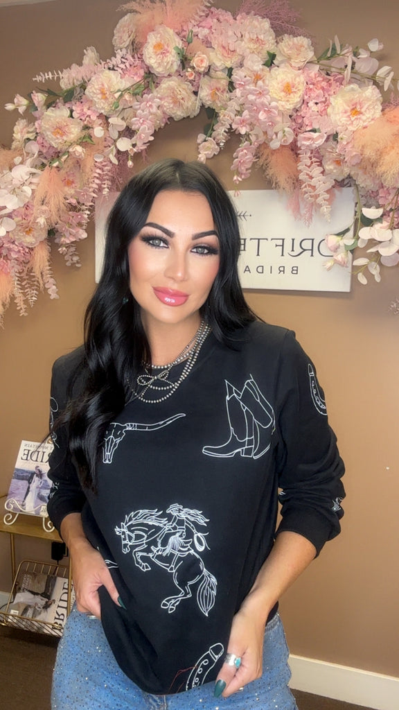 The Rowdy Cowgirl Sweater combines comfort with distinctive western flair. This ultra-soft crewneck showcases western sketches across the front and back, making a bold style statement. The relaxed fit provides effortless wearability, while ribbed cuffs ensure a polished finish.