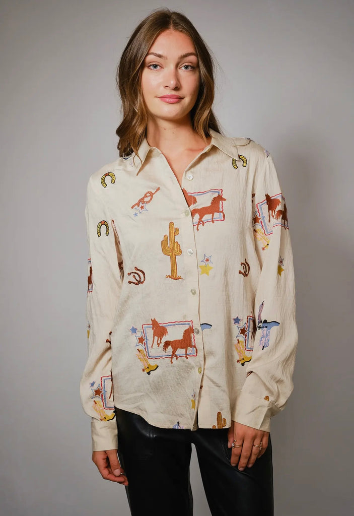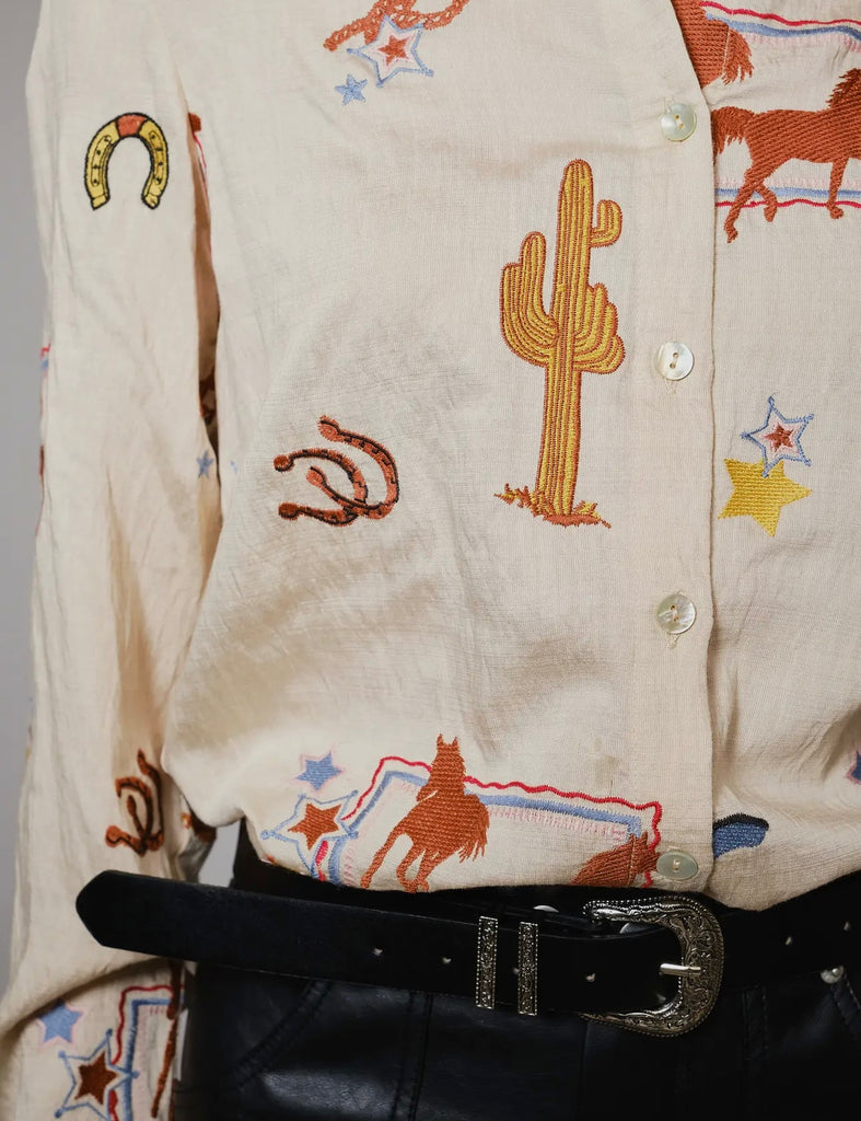 • Relaxed fit button front shirt with colorful western themed embroidery
