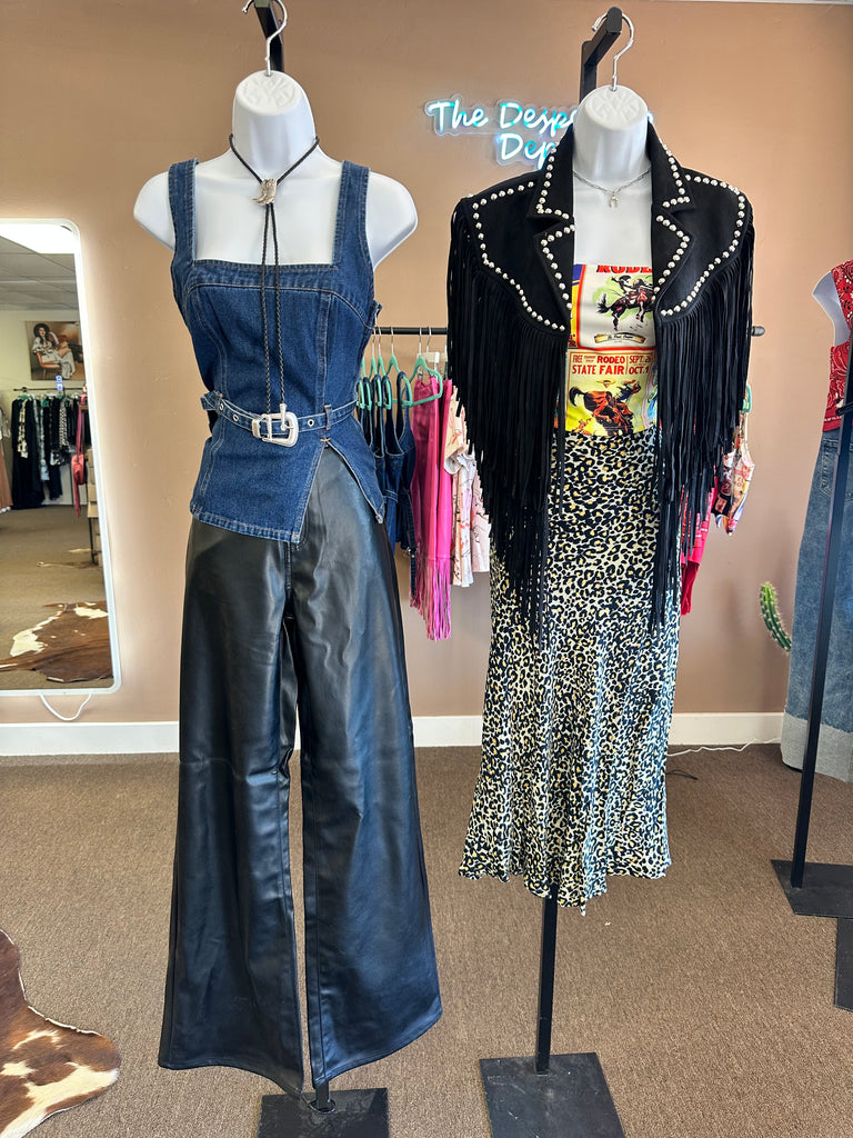 The Cowgirl Olivia Denim Top features a structured square neckline paired with a distinctive belt detail that accentuates the waist, blending classic denim durability with modern, refined tailoring.