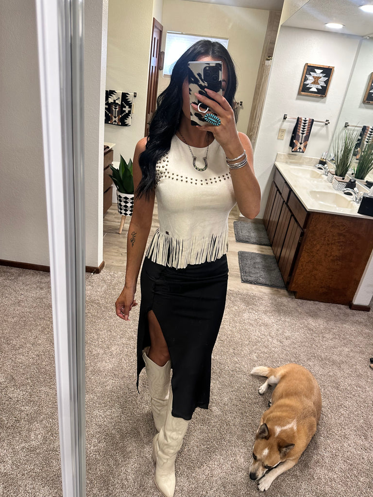 - This striking tank features antique brass-tone stud detailing along the front yoke and arm openings, creating a bold, structured silhouette. The bottom hem is finished with laser-cut fringe that adds movement and flair, making it perfect for rodeo nights, country concerts, or statement layering. Crafted from a soft, leather-like fabric with a clean crew neckline, this top merges edgy charm with Western sophistication.